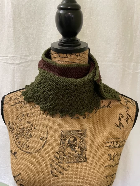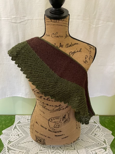 Lace-edged shawlette knitted from a merino, bamboo and nylon blend yarn. Shawlette measures approximately 34" long. Brown with green lace edging. Hand wash cool, lay flat to dry.