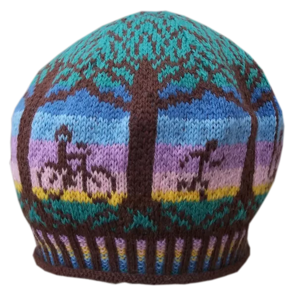 Much of my childhood was blissfully spent sitting among the branches of a favorite maple tree. Fresh air, exercise and lots of fun could be found there. I imagined the wedges on the top of a tam as the treetops and the rest of the hat began to fall into place. The spaces between the tree trunks seemed like empty canvases, waiting to be filled with pictures.The leisurely activities made me think of things we do in the evening, after work so of course the sun had to be setting….