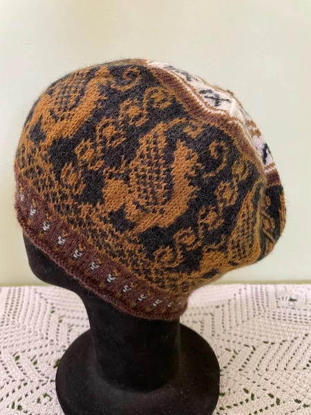 One of the heirlooms that has been passed down to me is a pendulum kitchen clock. It sits on a shelf and looks so very distinguished with an embossed griffin on the glass door.I was so pleased when my father gave me the clock, even though it did not work. It is so beautiful! But then for Christmas my four offspring pooled their resources and had the clock fixed.Now the lovely old thing not only looks good, but it sounds great, too! This hat is inspired by that treasured family heirloom.