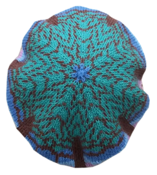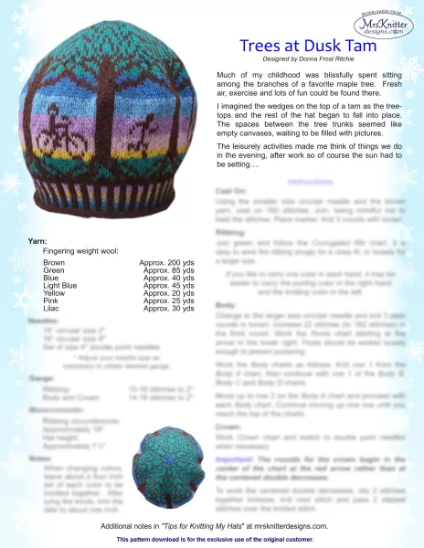 Much of my childhood was blissfully spent sitting among the branches of a favorite maple tree. Fresh air, exercise and lots of fun could be found there. I imagined the wedges on the top of a tam as the treetops and the rest of the hat began to fall into place. The spaces between the tree trunks seemed like empty canvases, waiting to be filled with pictures.The leisurely activities made me think of things we do in the evening, after work so of course the sun had to be setting….